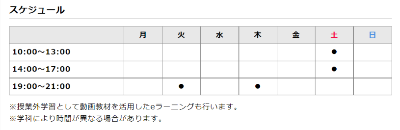 です。レッスンは平日夜間か土日で、校舎によって開講される曜日や時間帯が異なります。